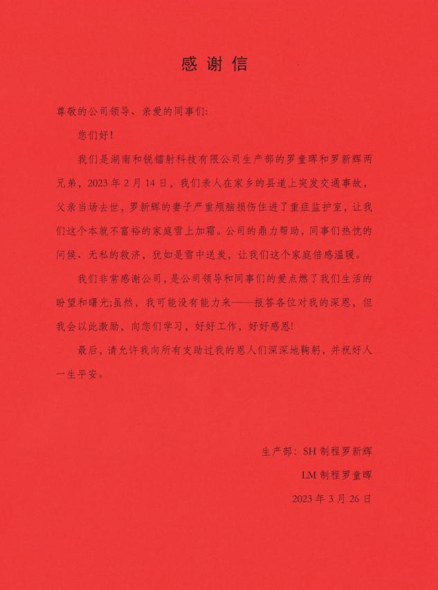 向困難員工愛心捐贈感謝信